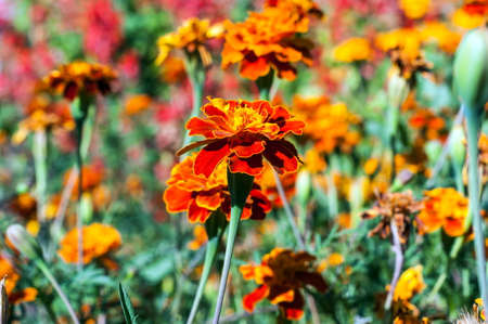 Marigolds, Mexican, Aztec or French Marigold in the garden. Macro patula or marigold tagetes in a flower garden a sunny day. Marigold background, wedding cards.
