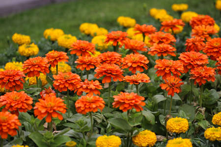 Yellow and orange marigold flowers in the garden close up