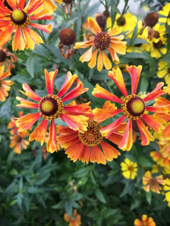 A group of small yellow-orange decorative garden flowers, side view. Beautiful little red flowers with green bushes around. Garden flowerbed. Blurred soft background.