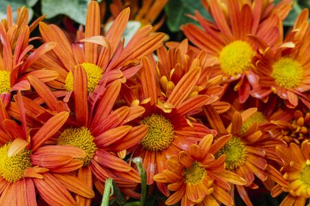 Orange hardy chrysanthemum plants as a pattern. Abstract flower background texture