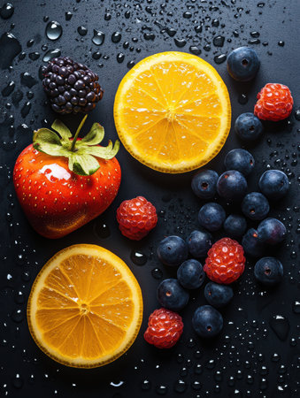 Fresh strawberries, orange slices, blackberries, and blueberries are arranged beautifully on a dark countertop, speckled with water droplets.