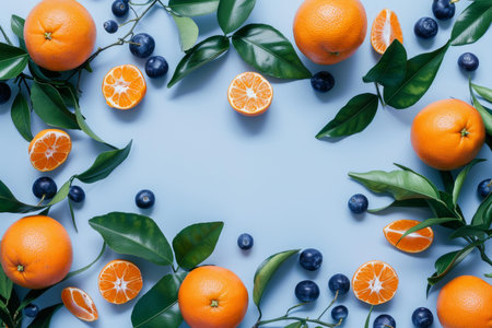 Citrus Fruits and Blueberries Collection, Vibrant Culinary Arrangement With Leaves and Blooms