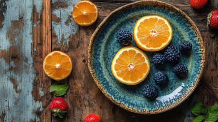 This captivating image showcases a rustic wooden table with fresh citrus fruit slices and assorted berries arranged on a vibrant plate for a healthy snack.