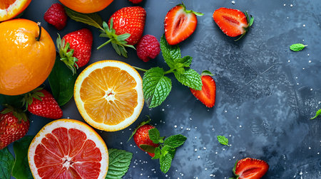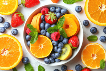 An artistic display of colorful berries, zesty citrus wedges, and fragrant mint sprigs on a textured white surface, inspiring vibrant healthy eating c