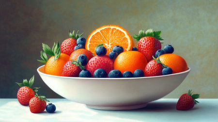 A vibrant bowl of fresh fruit with strawberries, blueberries, and oranges on a sunny table.