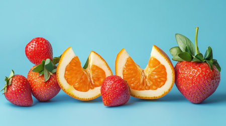 A vibrant mix of orange slices and strawberries against a light blue background.