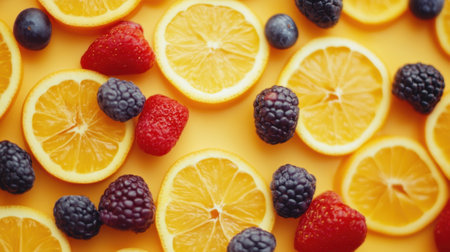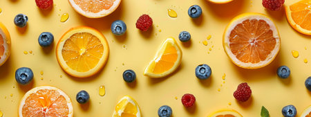 A bright and appetizing arrangement of citrus slices and berries, including oranges and blueberries, on a yellow background with honey drizzle. The vibrant colors and textures create a fresh and healthy look.