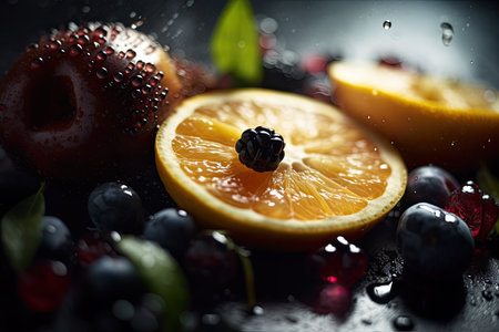 Juicy orange segment surrounded by vibrant berries, glistening with water droplets, set against a sleek, reflective black background for a refreshing