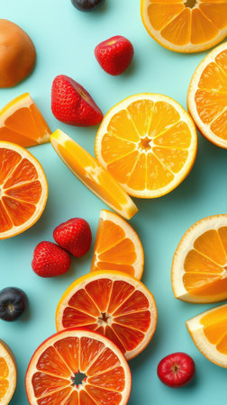 A vibrant assortment of fresh citrus fruits and berries on a bright background, showcasing slices of oranges, grapefruits, and berries.