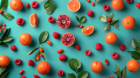 A colorful still life composition of assorted citrus fruits, berries, and lush green leaves, arranged against a rich teal background.