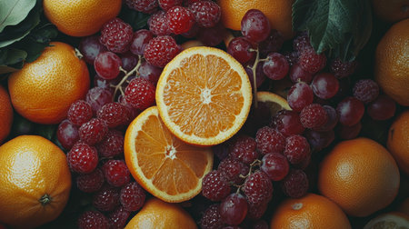 Close-up of assorted fresh fruits including juicy orange halves, raspberries, and grapes, creating a vibrant and colorful display.