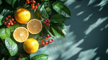 A vibrant arrangement of whole and sliced oranges, red berries, and glossy green leaves, illuminated by soft natural light on a textured surface.