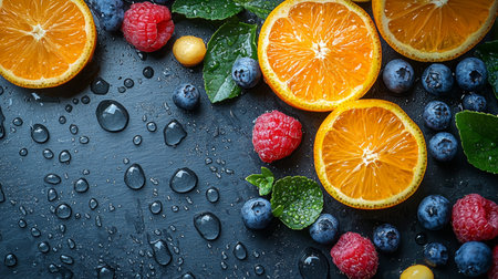 A mix of fresh orange slices, raspberries, and blueberries with water droplets on a dark background, emphasizing freshness and vibrancy.