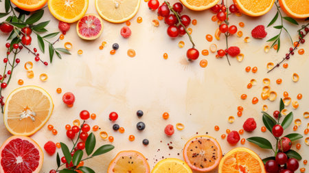 A creative display features various citrus fruits, berries, and leaves arranged artistically on a white surface. The circular layout enhances the colors and textures of the fruits.