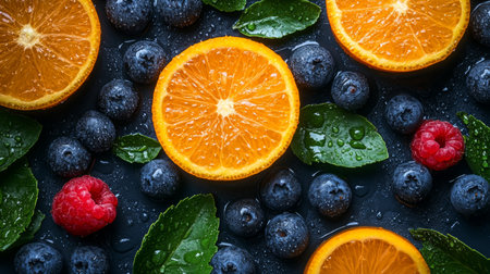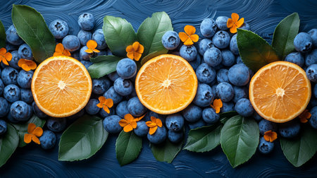 Fresh blueberries and orange slices arranged on a dark background with vibrant greenery, creating a striking contrast.
