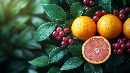 A vibrant arrangement of fresh citrus fruits and coffee berries surrounded by green leaves, showcasing natural beauty.