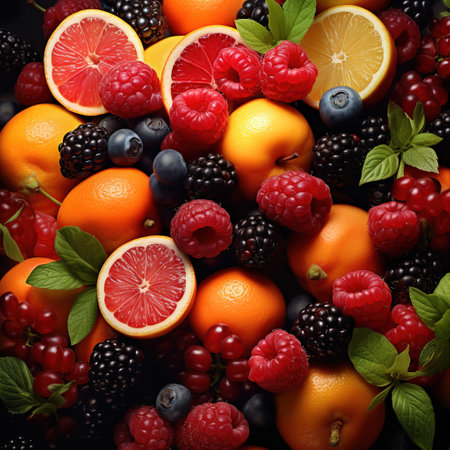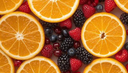 A vibrant still life featuring juicy orange slices, plump raspberries, blackberries, and blueberries. Textures create a captivating and mouthwatering visual display.