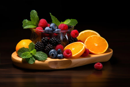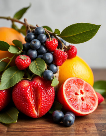 A vibrant display of fresh citrus fruits and berries arranged artfully on a wooden board, perfect for promoting healthy eating and inspiring culinary creativity.