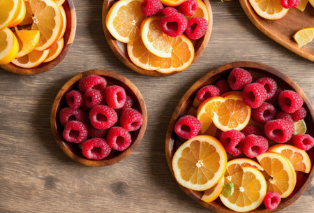Overhead view of a wooden tray holding raspberries and orange slices. AI generated.