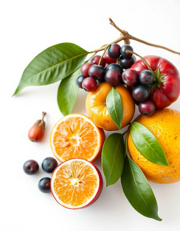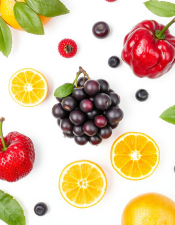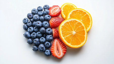 An array of vibrant fruits including orange slices, strawberries, and blueberries are artistically arranged on a clean white background, showing their fresh colors and textures.