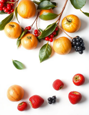 Array of vibrant fruits and berries displayed in an enticing pattern on a neutral white surface