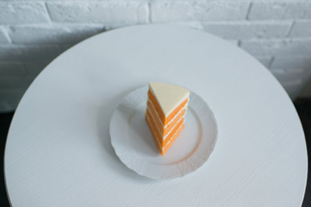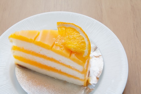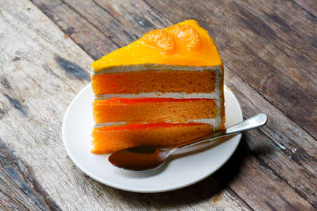 Orange piece of cake with layer and red cherry on white plate and wooden table