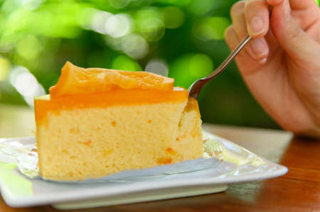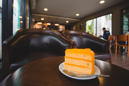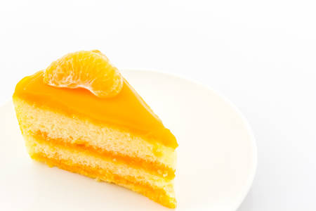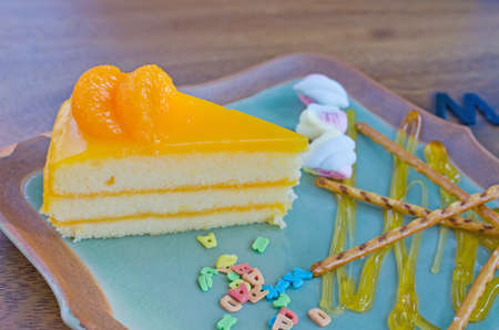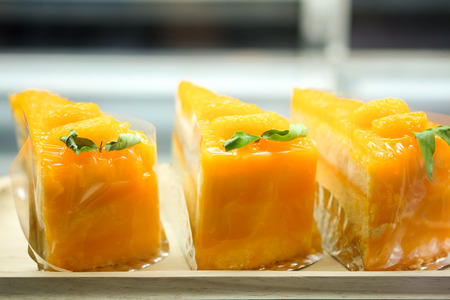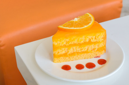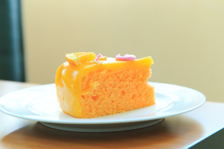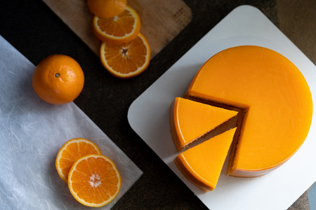 Food Series : Orange cake on a glass tray. Fruit cake on the table. Orange Homemade Cake.