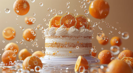 A close-up image of a layered cake with whipped cream frosting and orange slices, surrounded by bubbles on a beige background.