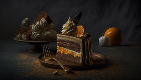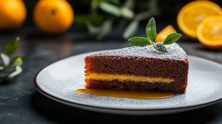 Delicious cake served on a white plate with slices and orange garnishes in the background