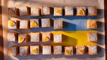 Delicious squares of dessert arranged on a light surface, reflecting Ukrainian colors.