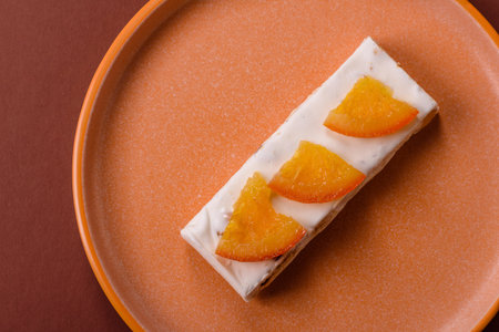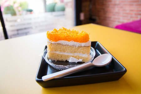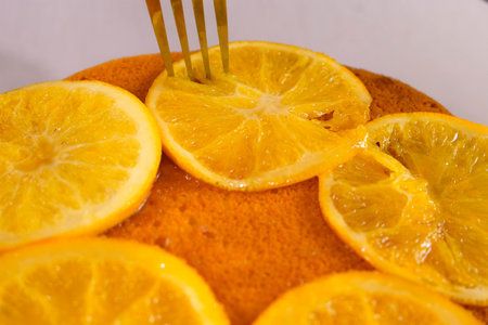 Top View of a piece of orange cake and sliced orange topping with spoon. Cake with orange mousse with copy space