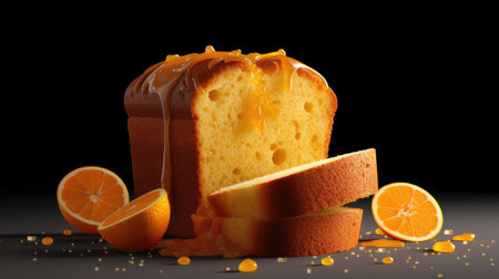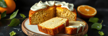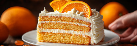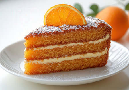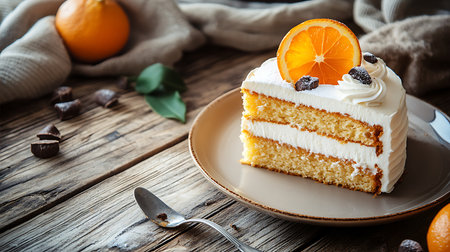 Slice of Homemade Orange Cake with Sweet Glaze on White Plate, Orange Slices, Rustic Background