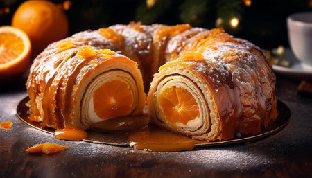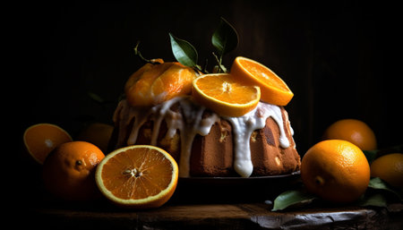 Fresh citrus fruit on a rustic table, a sweet homemade dessert generated by artificial intelligence