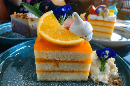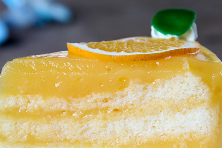 orange cake with orange and blueberry topping or fruit cake, piece of cake