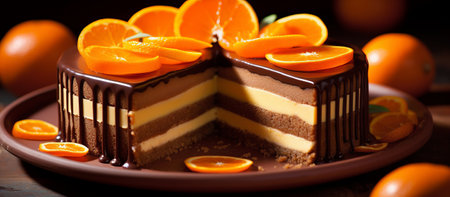 Delicious chocolate cake with oranges on a wooden background. Selective focus.