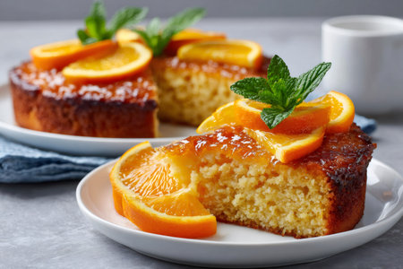 Orange cake with citrus glaze and fresh mint leaves on a white serving plate