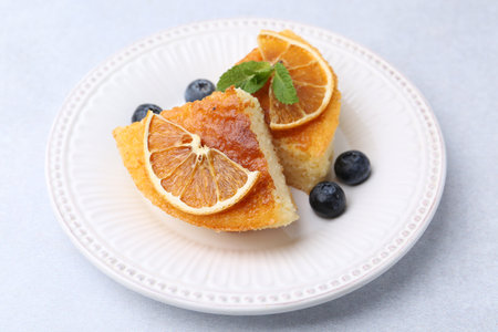Pieces of delicious semolina cake with blueberries and orange slices on light table, closeup