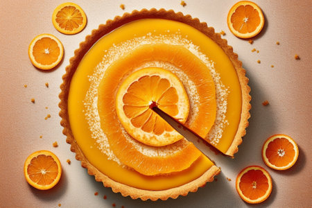 Generative AI : Tangerine creme brulee tart on a white background with fresh mint leaves and piece of tangerine
