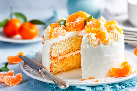 A vibrant, multi-tiered citrus cake featuring airy sponge layers, fluffy whipped cream, and juicy mandarin segments, perfect for celebrations or after
