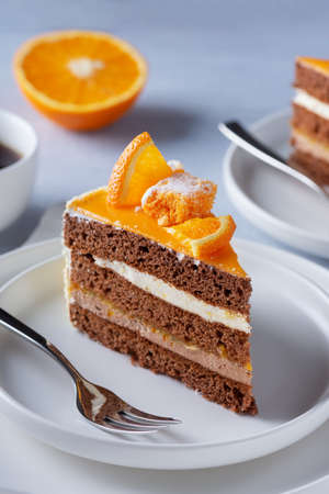 Orange cake with fresh orange slices on white plate. Dessert and Textured background. Rustic style