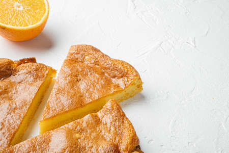Orange and mandarin cake with polenta set, on white stone table background, with copy space for text