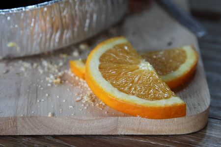 orange cake on a kitchen board with a sliced ​​orange and apricot in a wooden bowl, copy space