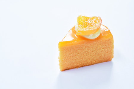 Slice of home baked Orange upside down cake with orange slices on the top. Shot on white background.