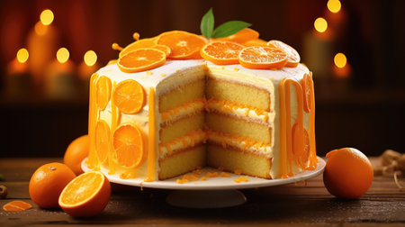 Delicious orange cake topped with fresh citrus slices on a rustic wooden table