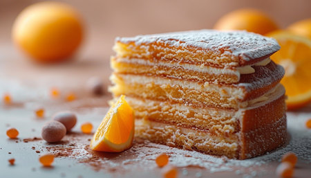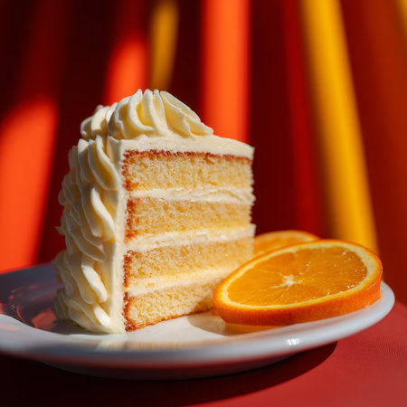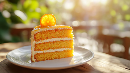 A delectable multi layered orange cake slice with rich white frosting and a fresh orange accent, bathed in warm outdoor light.