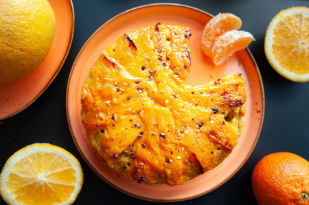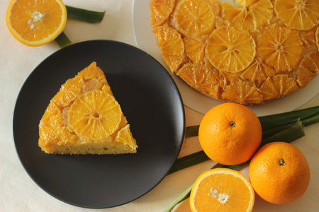 Orange upside down cake. Delicious homemade cake with organic orange slices.
