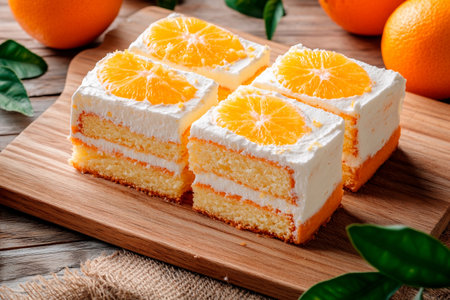 Slices of moist orange cake are beautifully displayed on a wooden board, topped with fluffy cream frosting and garnished with fresh orange slices. The vibrant colors enhance the dessert's appeal.