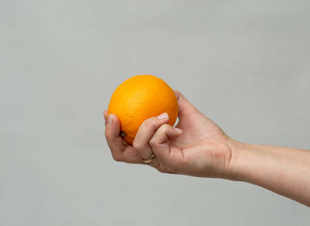 Woman holding orange in her fingers. Light gray background. Horizontal view.