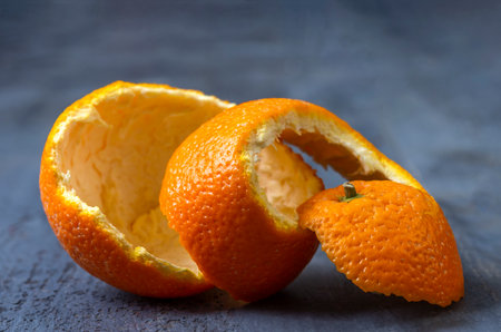 A whole clementine sits above a peeled clementine with its skin artfully arranged around it, on a vibrant blue surface with shadows.