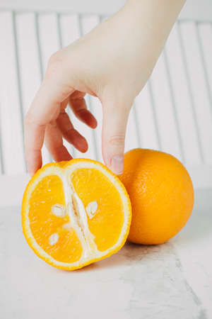 girl's hand holding half of orange over yellow background. fresh fruits concept. summer juice or smoothie making. children meal for vitamin supply.